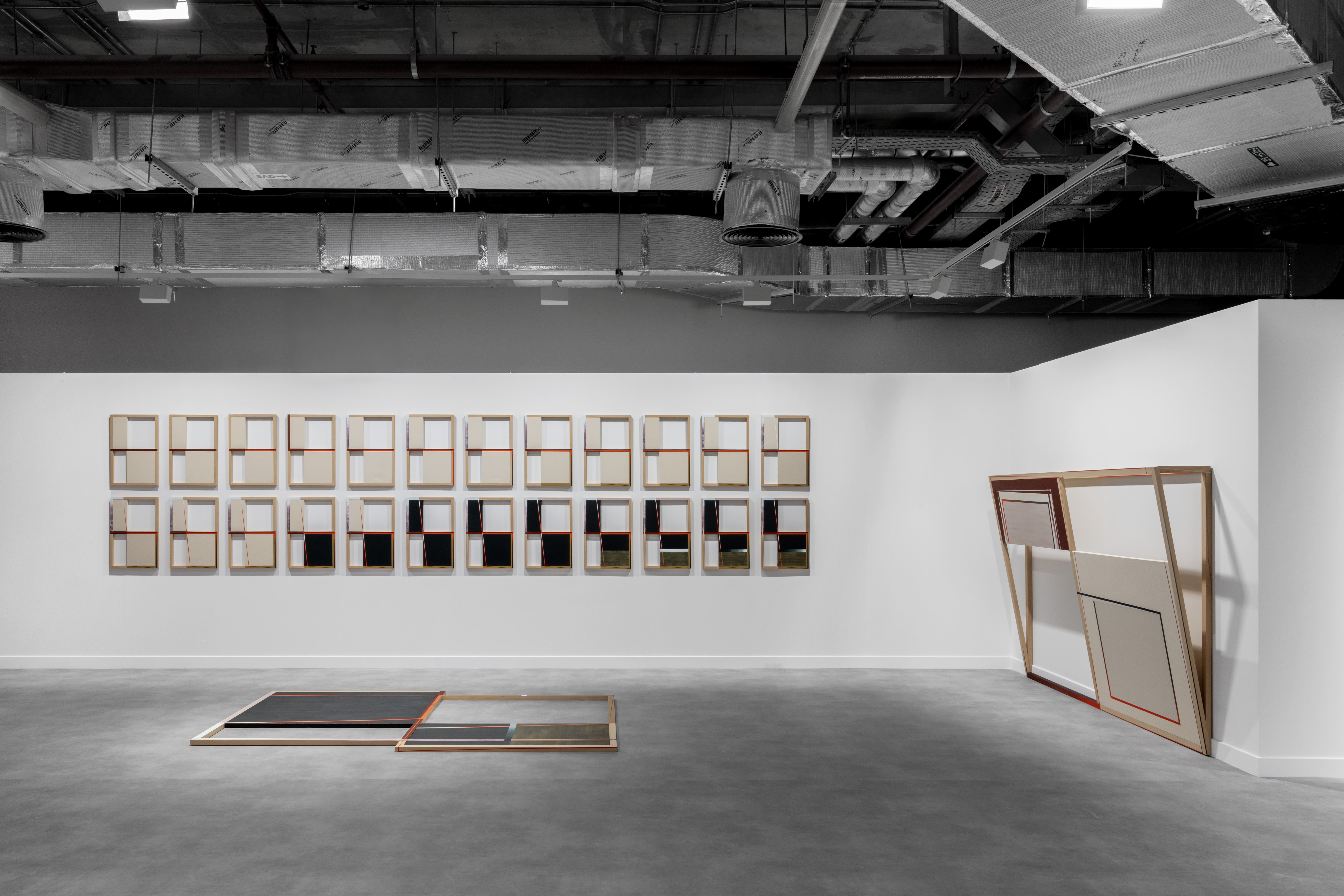 This configuration gives way to a second work on the adjacent wall, where the form re-emerges: shifted, fractured, reassembled as a ramp-like structure. Finally, the system extends onto the larger floor-based structure, which introduces dimensionality and spatial weight. Through these evolving configurations, Almehairi emphasizes process over permanence: form is not singular, but in continual negotiation with space, architecture, and the act of making.
