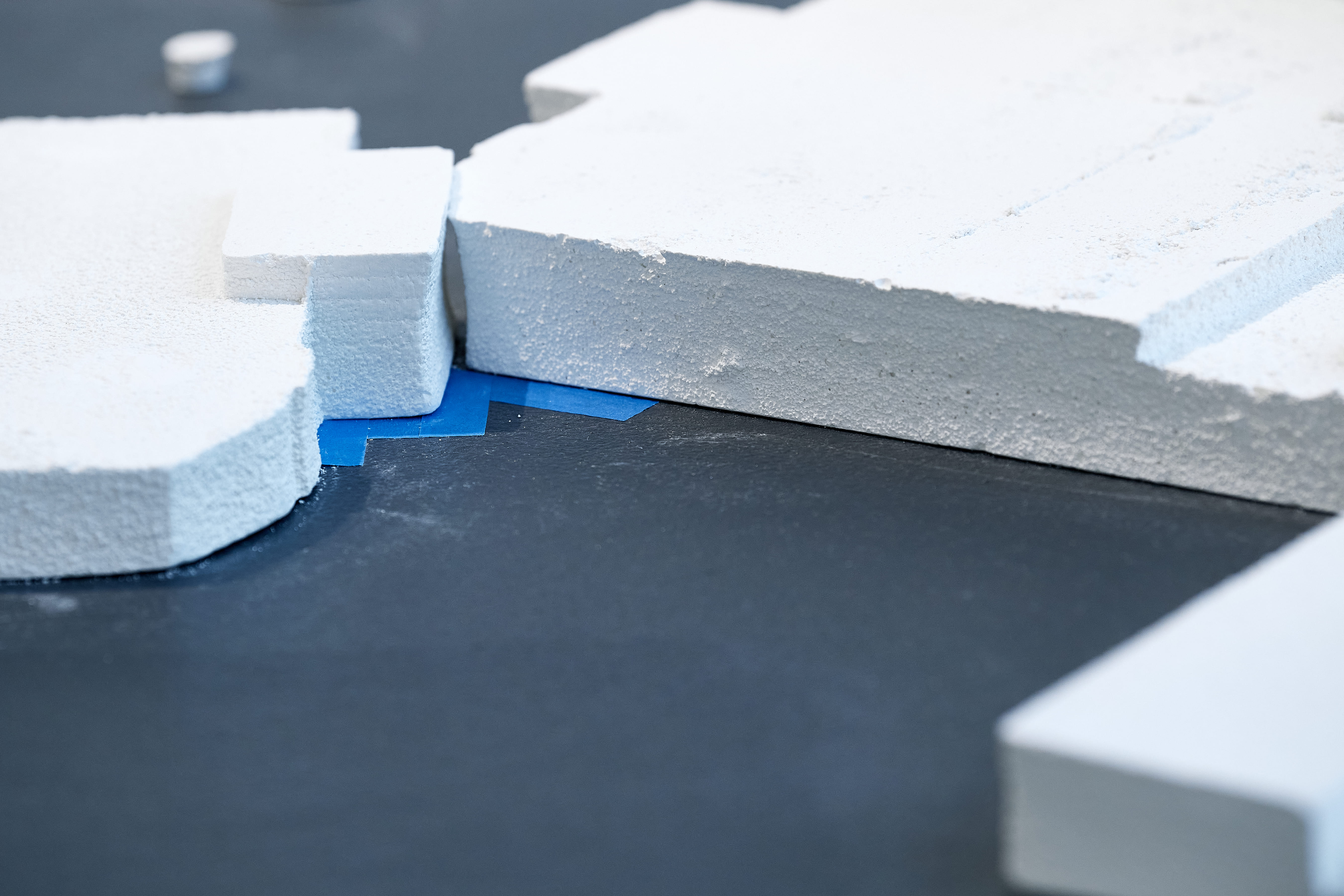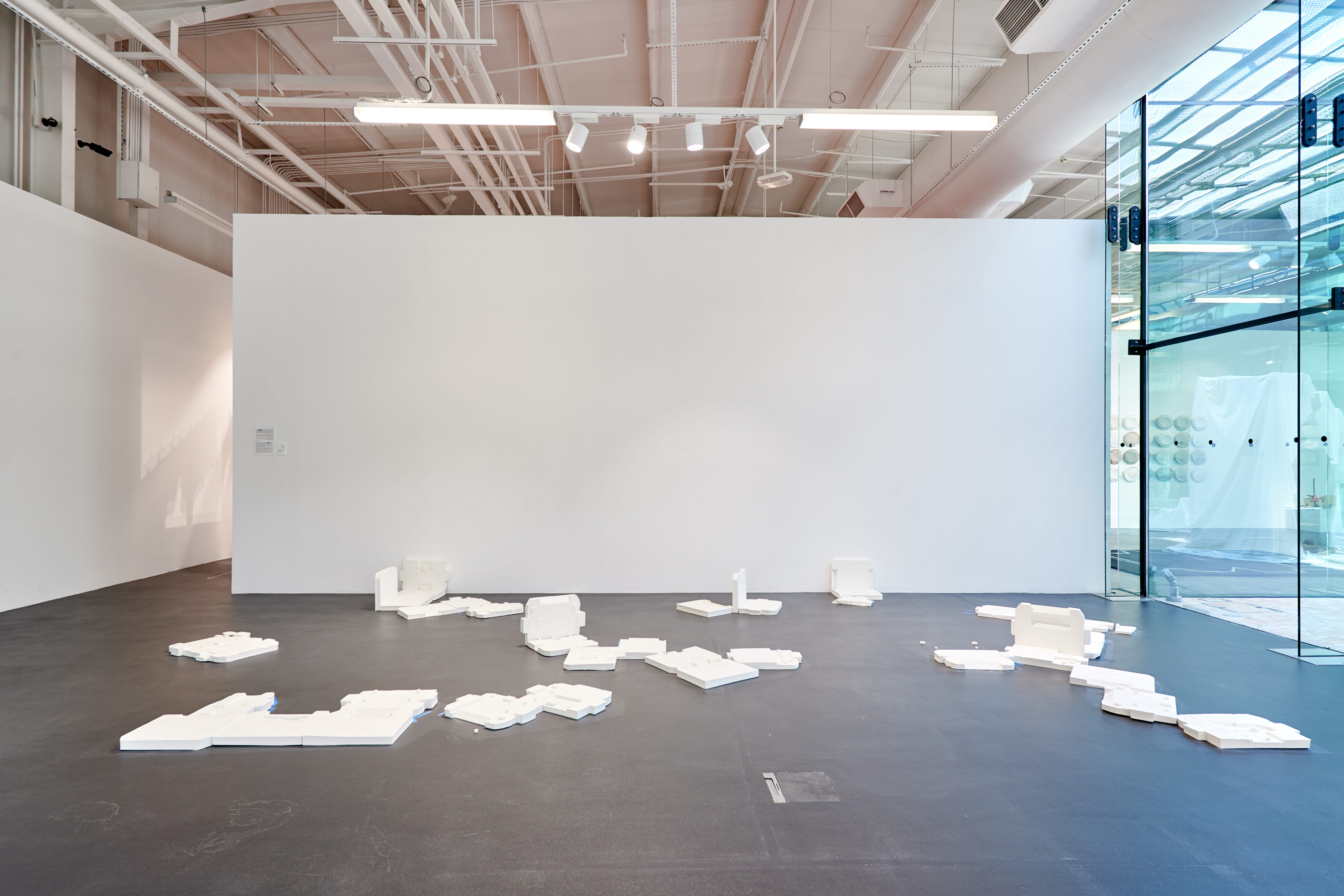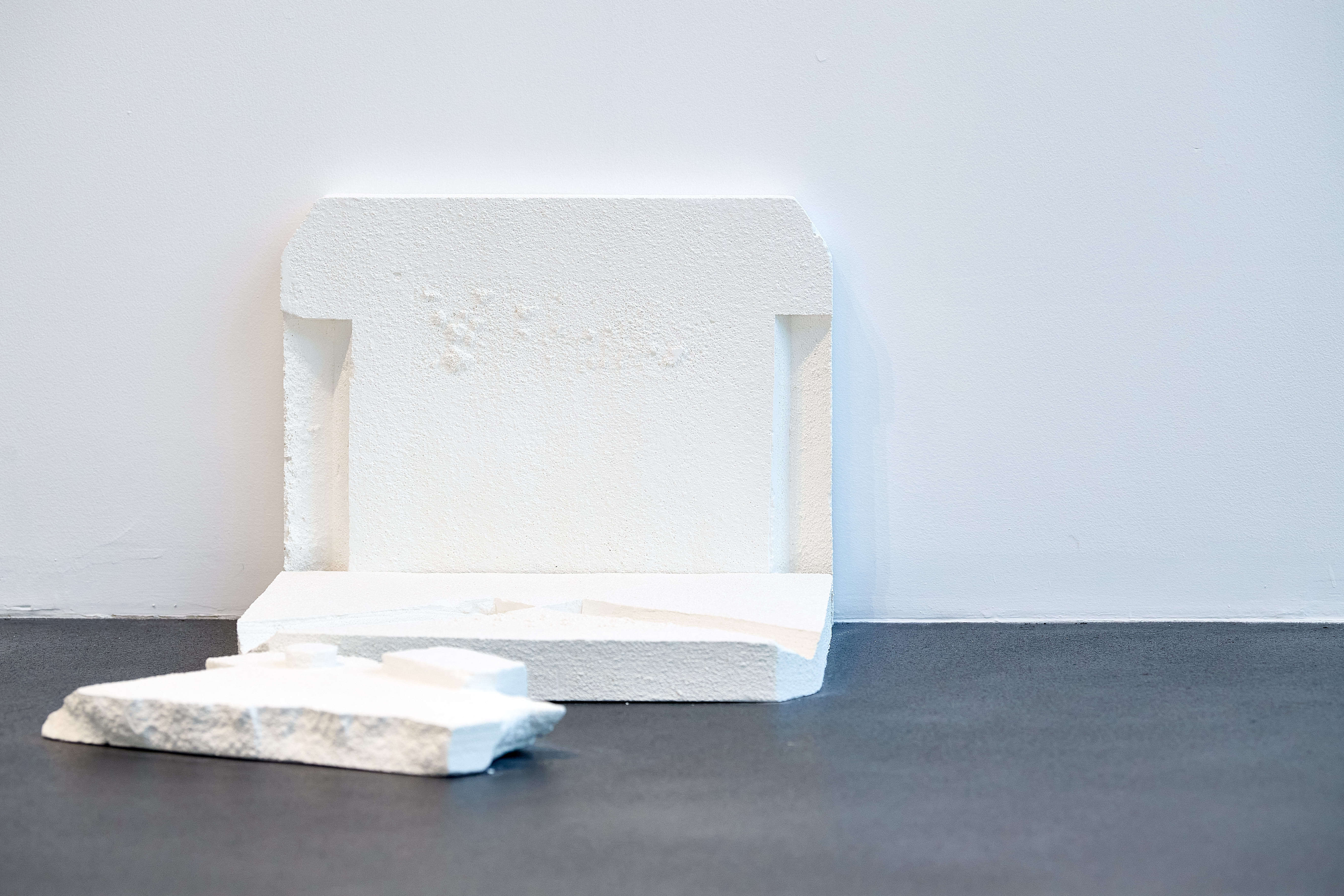 Sarah Almehairi’s artifacts have the air of eroded replicas. Stripped from their signifiers, it’s not obvious that all 40 casts are original molds – from a projector’s Styrofoam container. In Almehairi’s play on copies as originals – arranged in multiples like flat-pack furniture – a kind of futuristic domesticity arises. A Filled Form is Familiar has modular logic. In architectural exercises, Almehairi finds containment in unenclosed space, putting modules together and taking them apart differently each time. These are forced relationships, her language of forms implies. She moves away from the grid to create a new compartmentalized vocabulary, a repositioning.